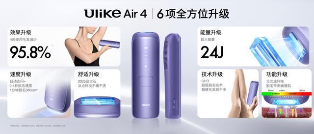 据介绍,Ulike Air 4通过6项全方位升级,使其更适合白领、上班族使用。因为24J超大能量,脱毛效果更好,4周毛发有效减少95.8%。而且,Air 4搭载了高端院线使用的SHR超级脱毛1.0技术,凭借0.4秒的脱毛速度,搭配自动连闪科技,1分钟能够脱毛360平方厘米,让脱毛效率更快更省时。另外,Air 4同样使用了2025蓝宝石冰点科技与全光波科技,让脱毛带来嫩滑肌。