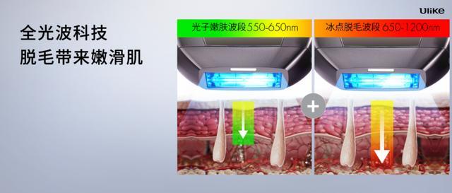 第六、脱毛后皮肤如何更显白嫩问题。Ulike Pro 10带来了全光波科技,在650nm-1200nm院线冰点脱毛的基础上,叠加550nm-650nm的院线光子嫩肤波段,让脱毛带来嫩滑肌。