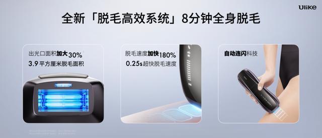 第五、全身脱毛耗时长的问题。Ulike Pro 10出光口面积加大30%,达到3.9平方厘米的超大脱毛面积,结合0.25秒超快脱毛速度,搭配自动连闪科技,一分钟可以脱毛520平方厘米,全身脱毛仅需8分钟。而且无效面积小,脱毛1次就好,没有漏脱烦恼。
