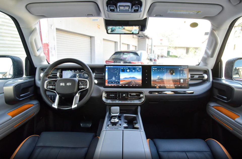 关键现在北京bj40内饰已经提供了智能化大屏幕,特别是台面的整个右侧并排布局了两个12.8英寸的大屏幕,这就给副驾驶乘客提供了单独的娱乐屏幕。而且现在即便是选择入门版本车型,也是全系无差别提供了高通8155芯片,智能化水平已经完全可以竞争即将上市的新版坦克300。
