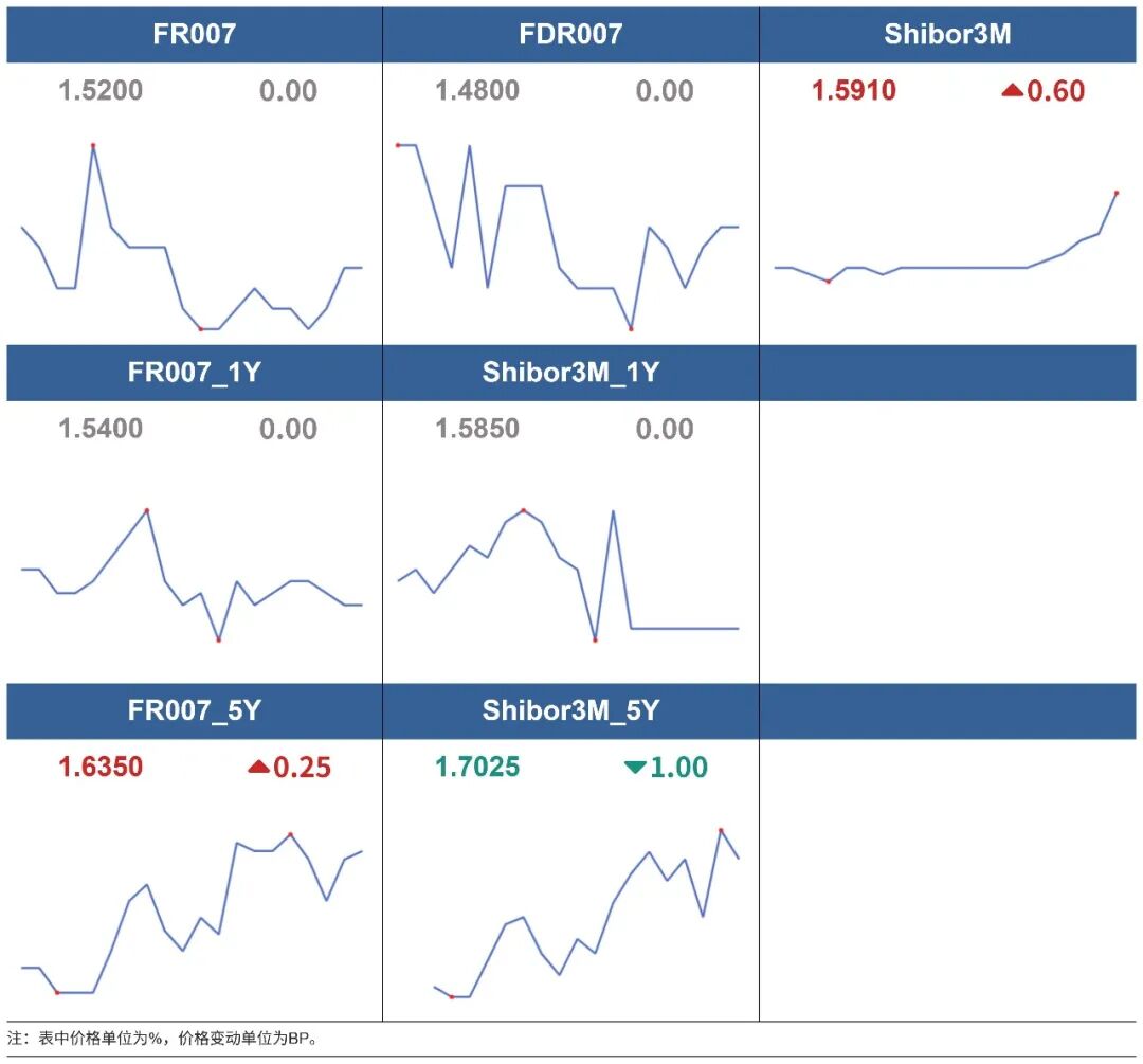 隔夜、1个月、3个月Shibor分别报1.274%、1.533%和1.591%,分别较前下行0.5BP、上行0.8BP和上行0.6BP。